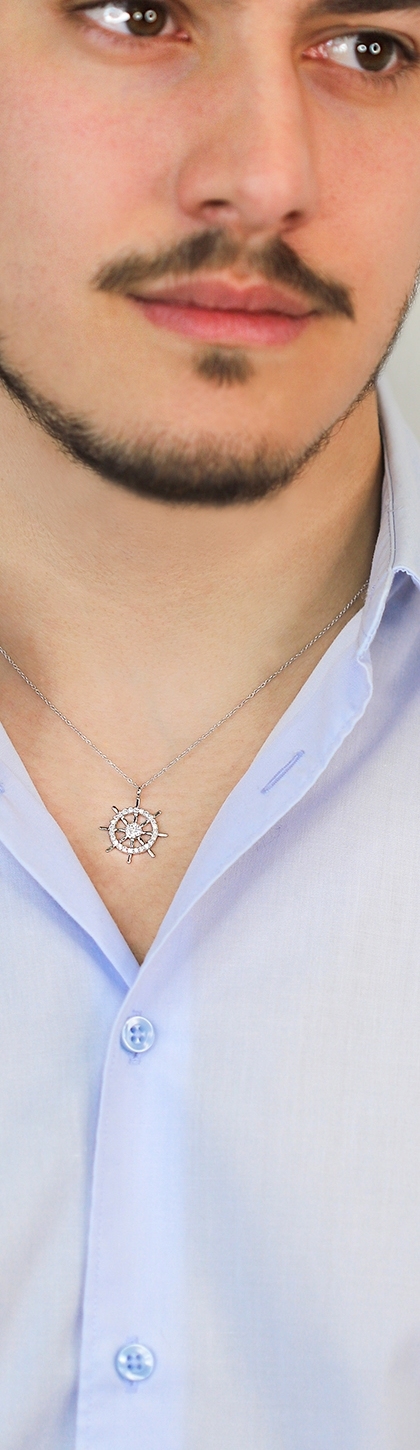 Collana in oro bianco 18k con ciondolo timone in diamanti, catena rolò 45+5 cm