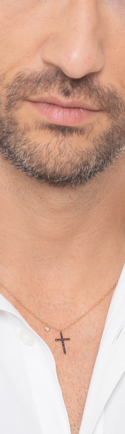 Collana in oro rosa 18k con pendente a Croce in diamanti neri e punto luce con diamante, 50 cm
