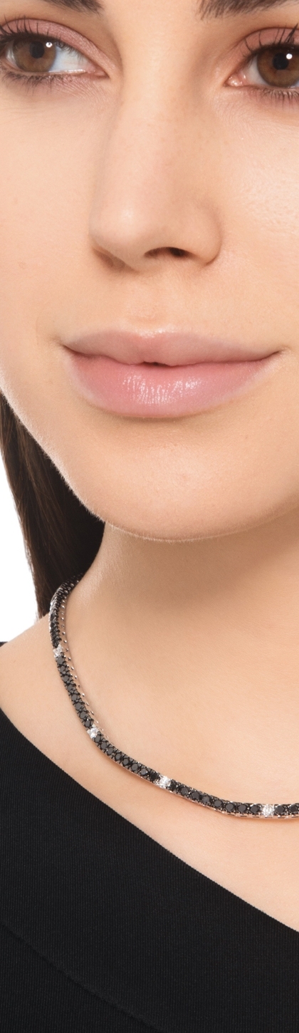 Questa collana tennis con diamanti neri presenta diamanti bianchi che vanno a spezzare il loro colore intenso aggiungendo dei delicati punti luce alla collana.