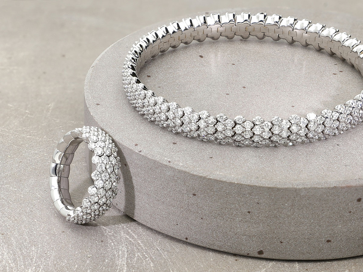 Forme e geometrie che si intersecano in intrecci preziosi. Scopri l’insieme di forme e geometrie della linea Intrigue: anelli e bracciali elastici e groumette in oro bianco, in oro rosa 18k e diamanti naturali che renderanno il tuo stile davvero unico.