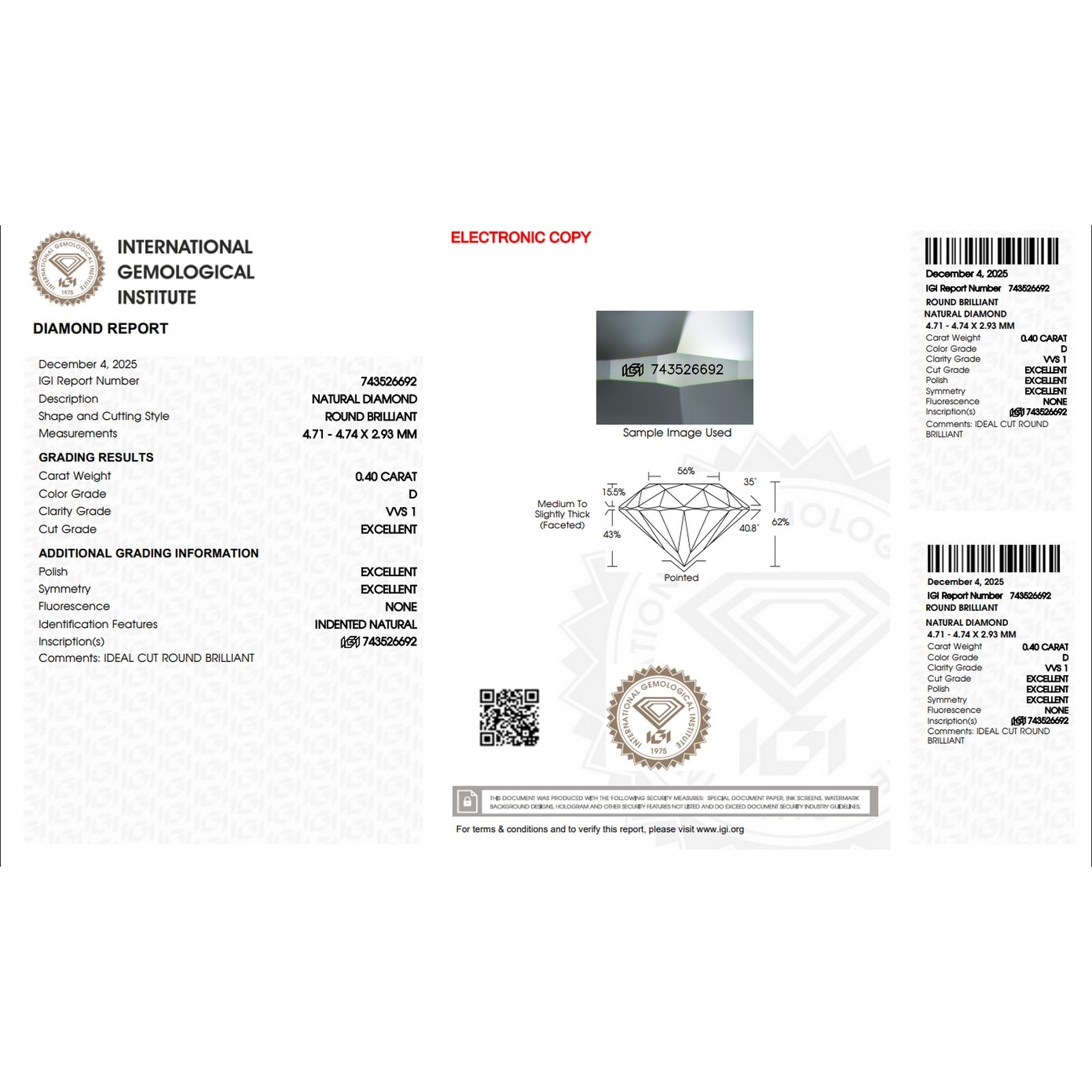 Diamante Certificato IGI CT 0,40 D VVS 1